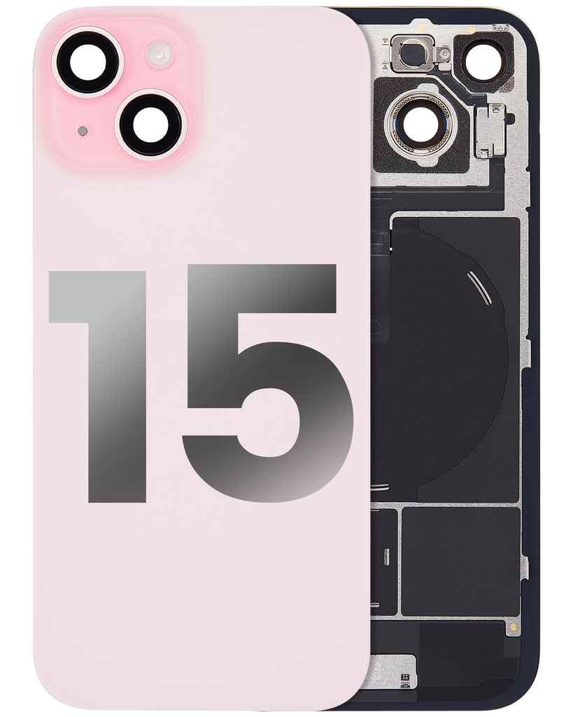 Back Glass With Steel Plate With Wireless NFC Charging MagSafe Magnet & Flashlight Flex Compatible For iPhone 15 (Used OEM Pull: Grade A) (Pink)